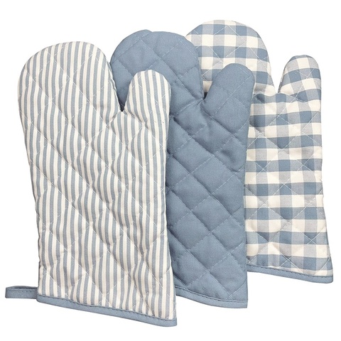 Manoplas azules para horno a cuadros franceses al por mayor, resistentes al calor, antideslizantes, de grado alimenticio, 100% de algodón, manoplas de cocina personalizables